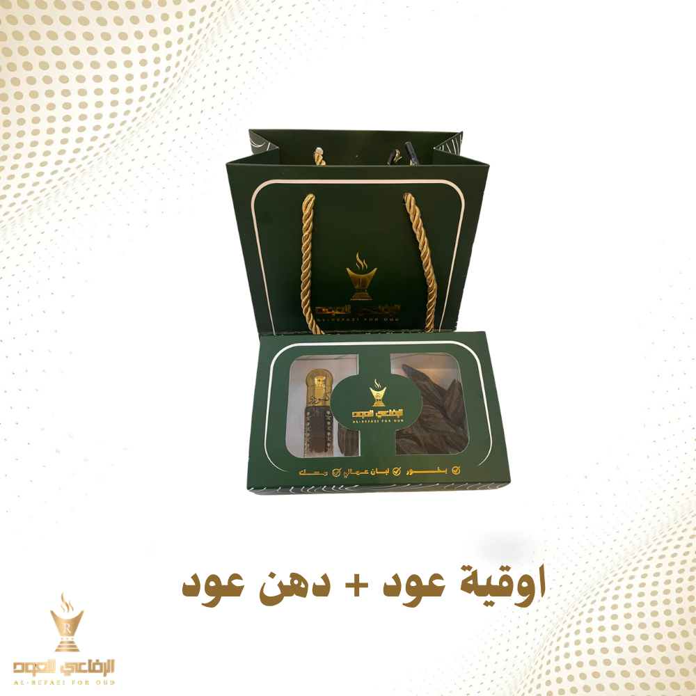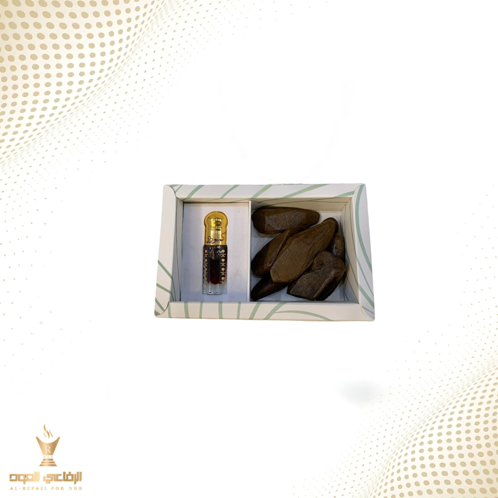 علبة أنيقة بتصميم فاخر تحمل توقيع “الرفاعي للعود”، تأتيك مقسمة بعناية لتضم: