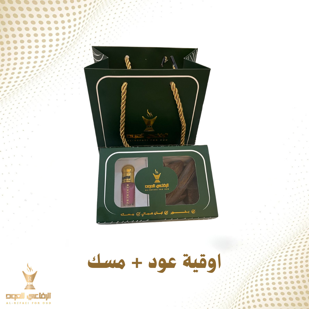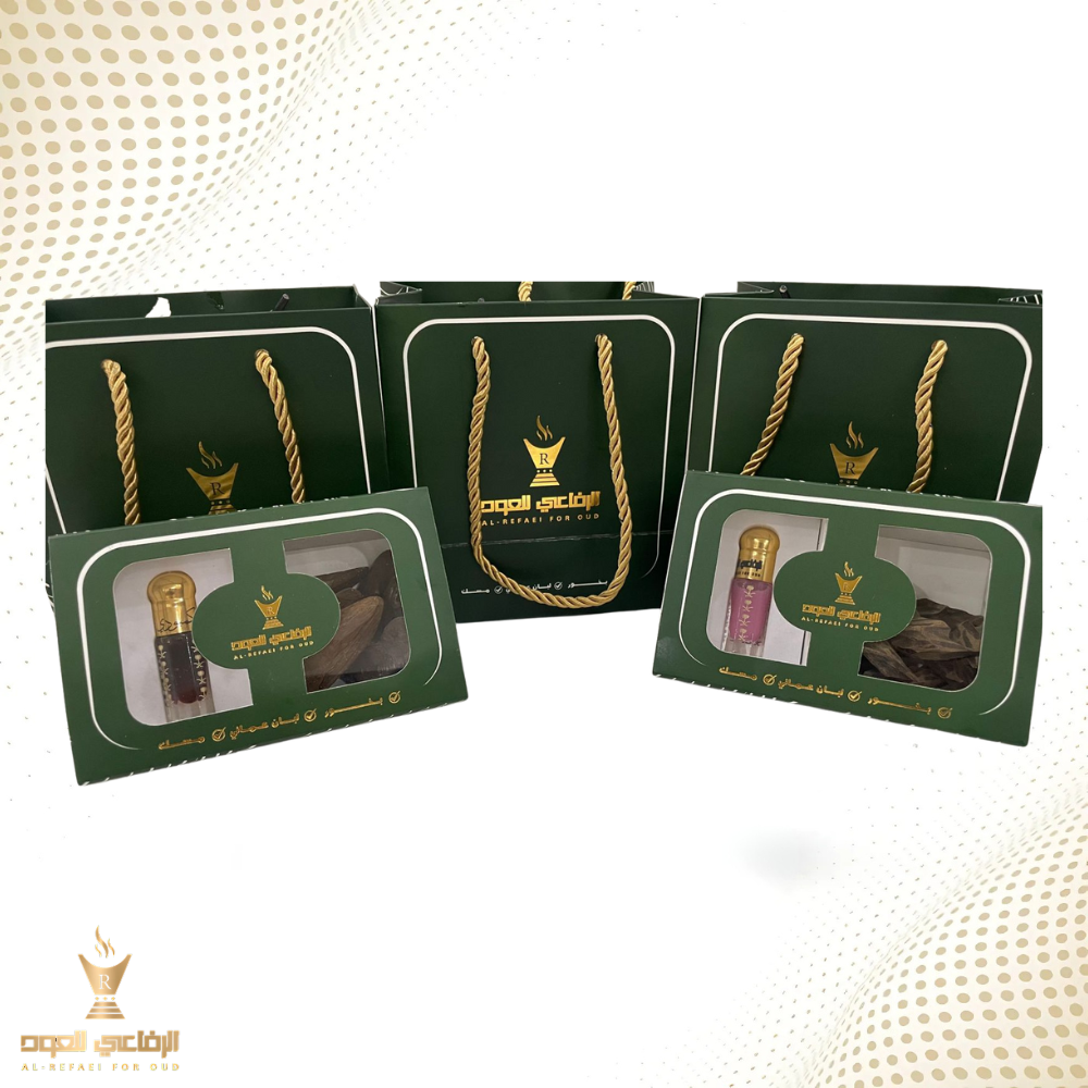 علبة أنيقة بتصميم فاخر تحمل توقيع “الرفاعي للعود”، تأتيك مقسمة بعناية لتضم: